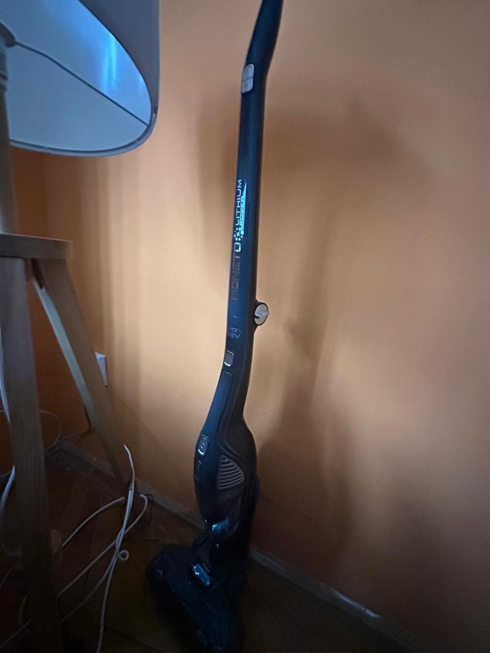 There is a vacuum with handheld attachment in the living room behind the sofa. The power button is at the top of the handle. You can adjust the level by hitting the power button.