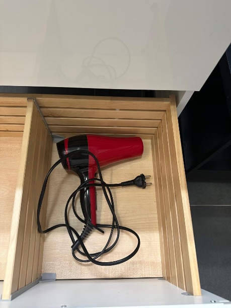The hair dryer is kept in the drawer under the bathroom sink.