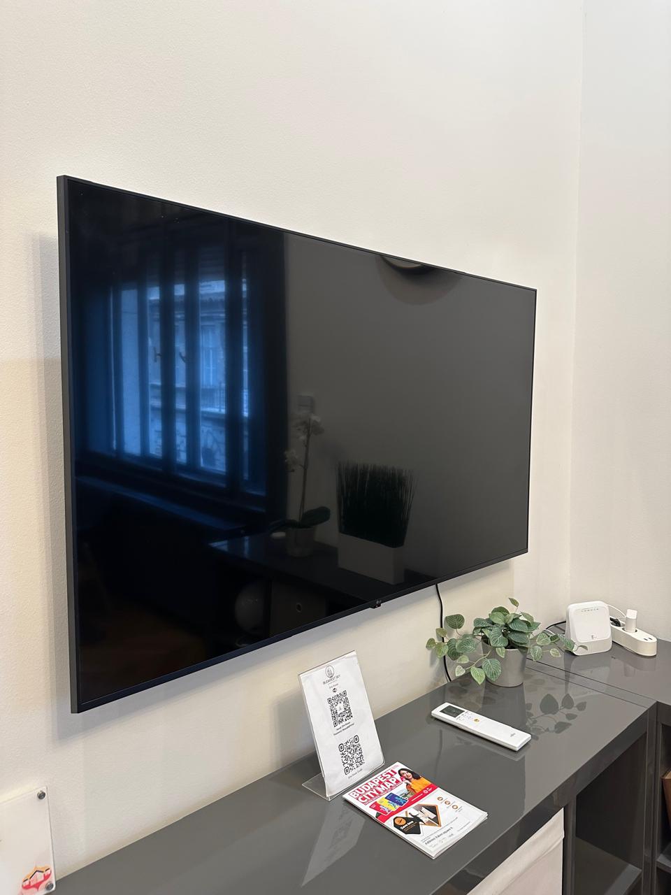 There is a TV in the living room. Use the white remote to connect to Chrome cast.
