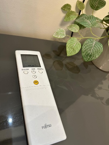 There are two air conditioners, one in the living room and the other in the back bedroom. The air conditioners are controlled by a remote control. A good temperature to set for heat is 19 degrees. Turn it on with the red power button in the top middle. The mode button switches between heat, air conditioning, and fan. You will not need to use the air conditioner for heating because the radiators are sufficient. Press the up arrow to increase the temperature and the down arrow to decrease the temperature.