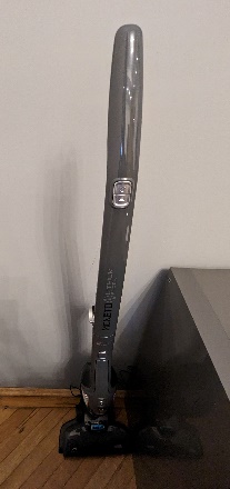 There is a vacuum with handheld attachment in the living next to the couch.