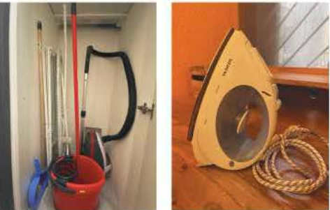 The iron, ironing board and drying rack are inside the closet storage next to the stove. A mop bucket and cleaning supplies are inside the closet storage next to the stove.