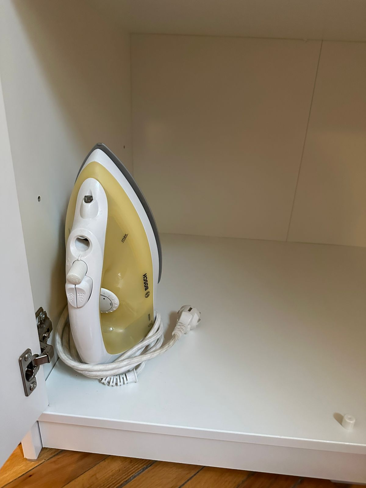 The Iron, board, and drying rack are inside and to the left of the cabinet in the bedroom.