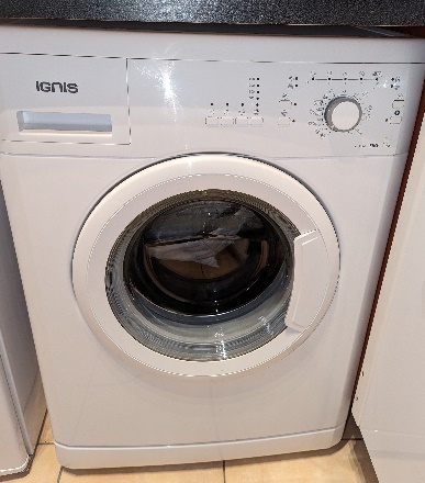 There is a clothes washing machine in the apartment. Place the washing liquid in the drawer on the top left. To turn on the machine, start turning the dial. For a normal wash select the 40 degrees with the trousers symbol next to it. To start the cycle, hit the arrow button on the bottom right. The maximum load is only 5 kg, so please do not fill too full.