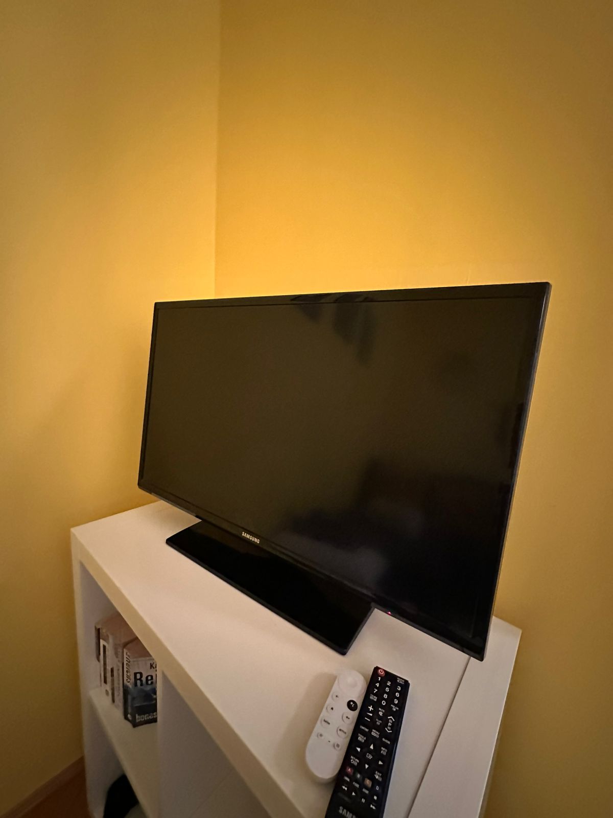 There is a TV in the living room and next to it the remotes.