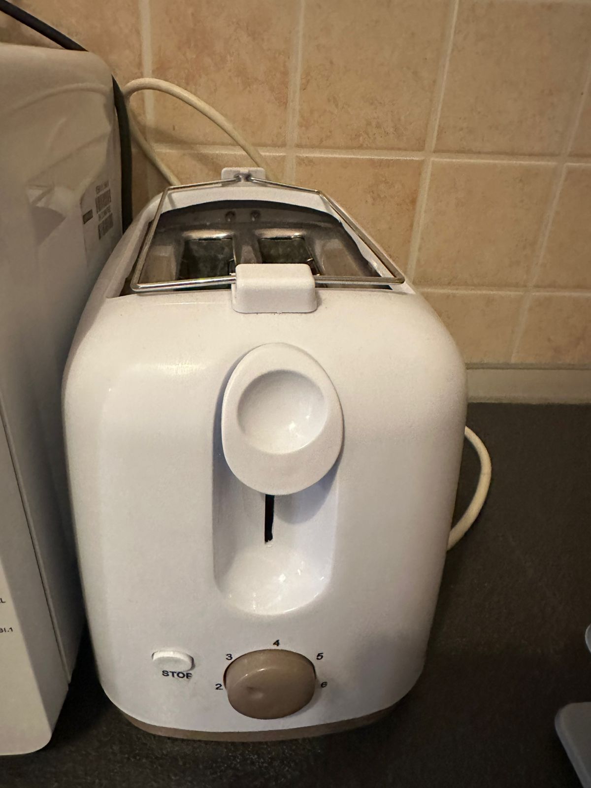 There is a toaster in the kitchen. Insert bread into the slots. Set browning level and press the level down.