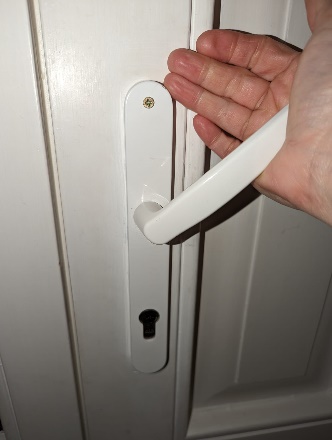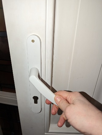 In order to open the door, push down on the handle. In order to lock the door from both the inside and out, you must lift up the handle all the way (it will click and turn the bolt).