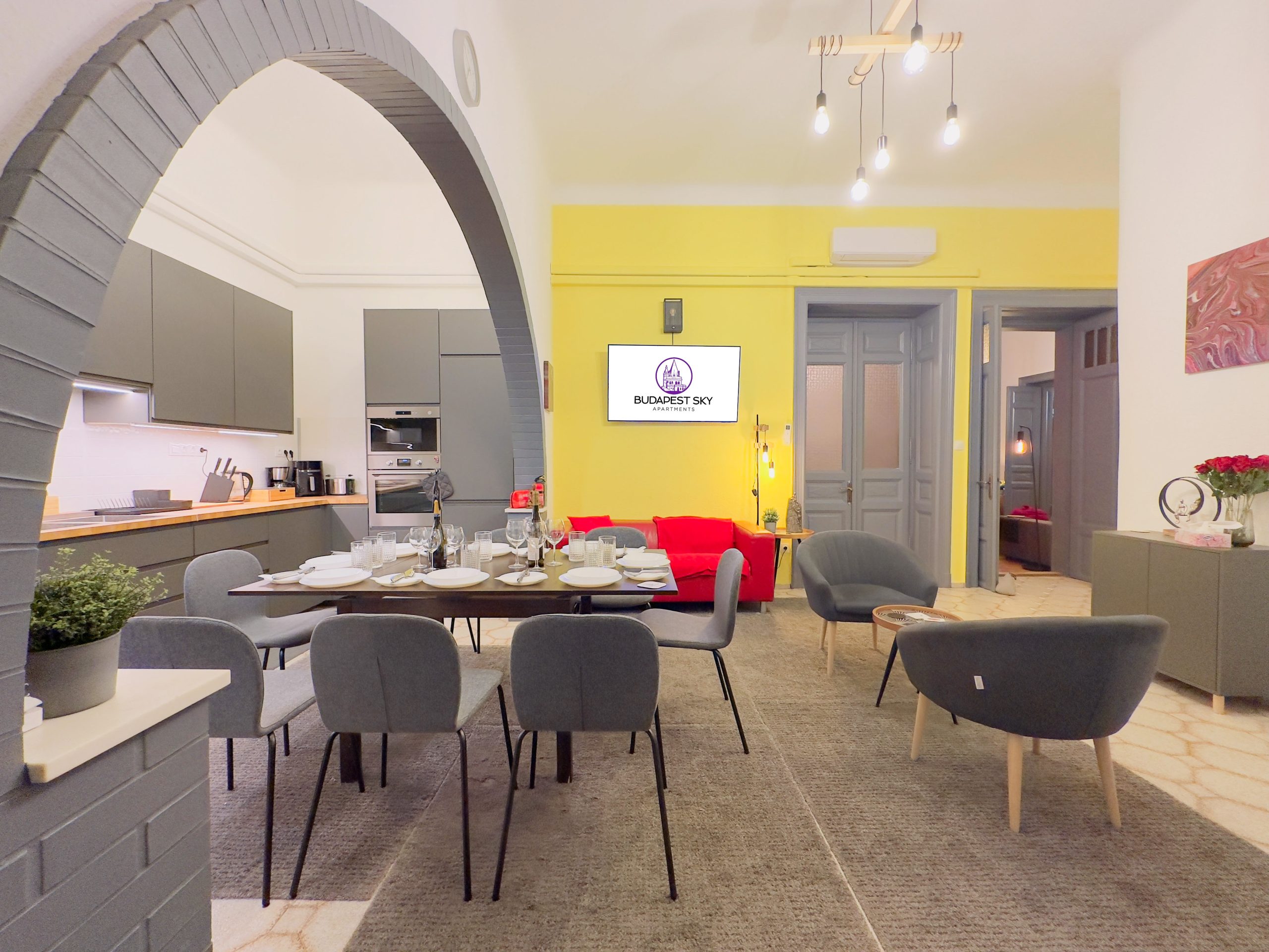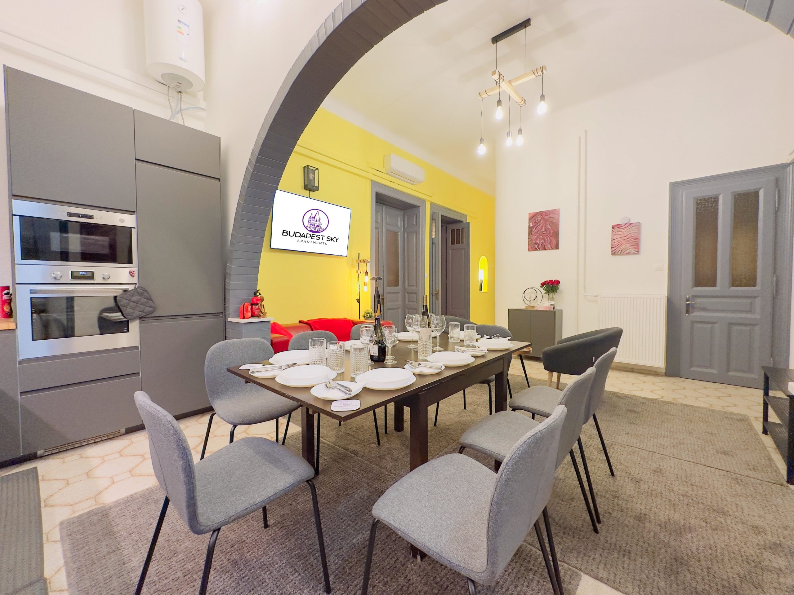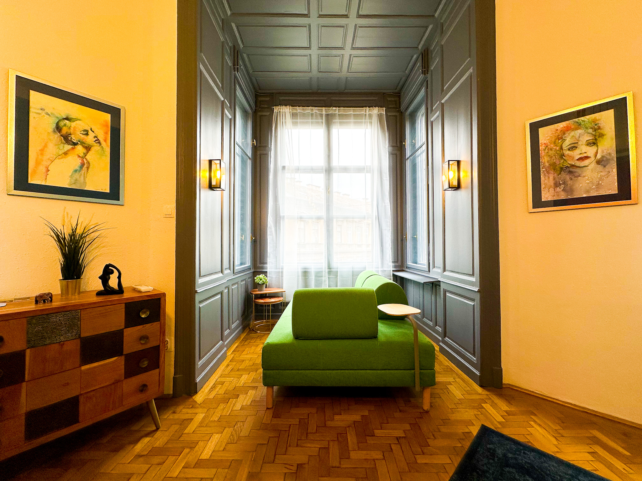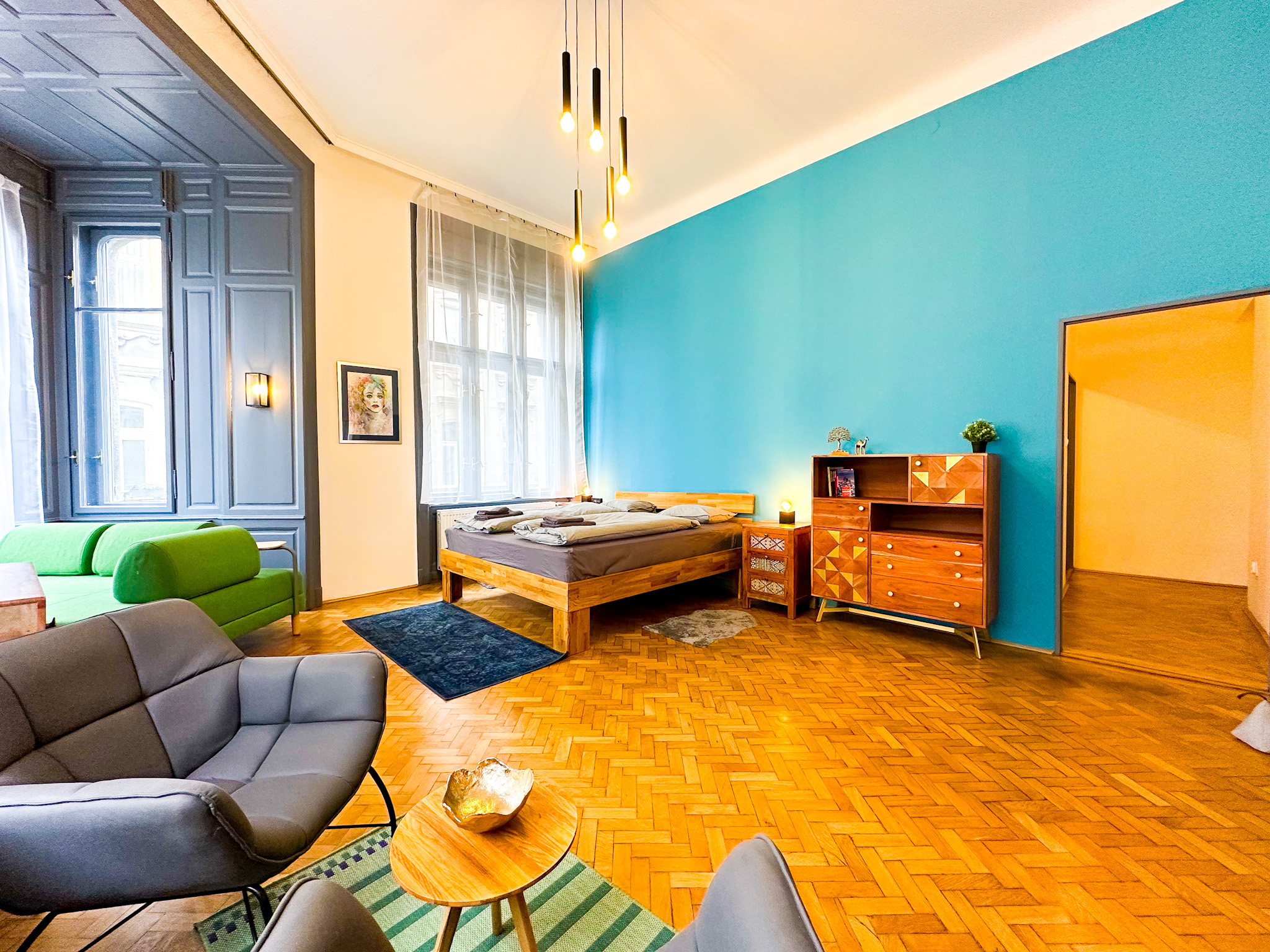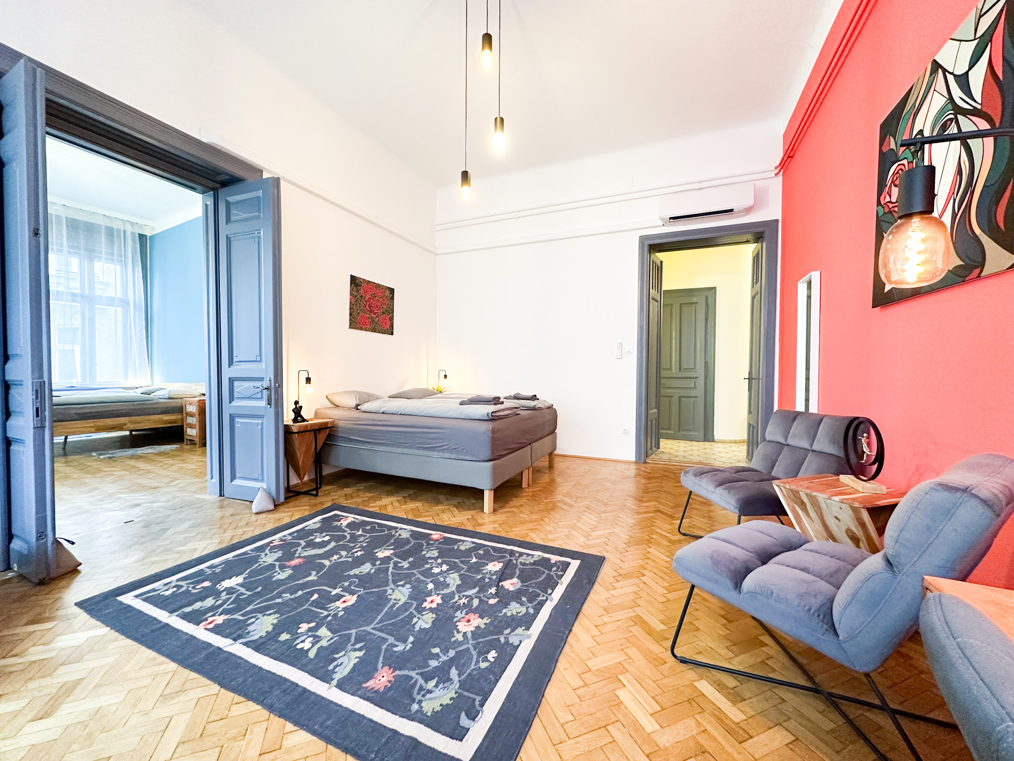 A huge, artsy, bright five-bedroom apartment right in central Budapest in a beautiful old building. It is in a quiet neighborhood, but just down the street from restaurants and nightlife and easy access to all tourist attractions. You can walk or hop on the public transportation to get to most anywhere you want to go in Budapest.