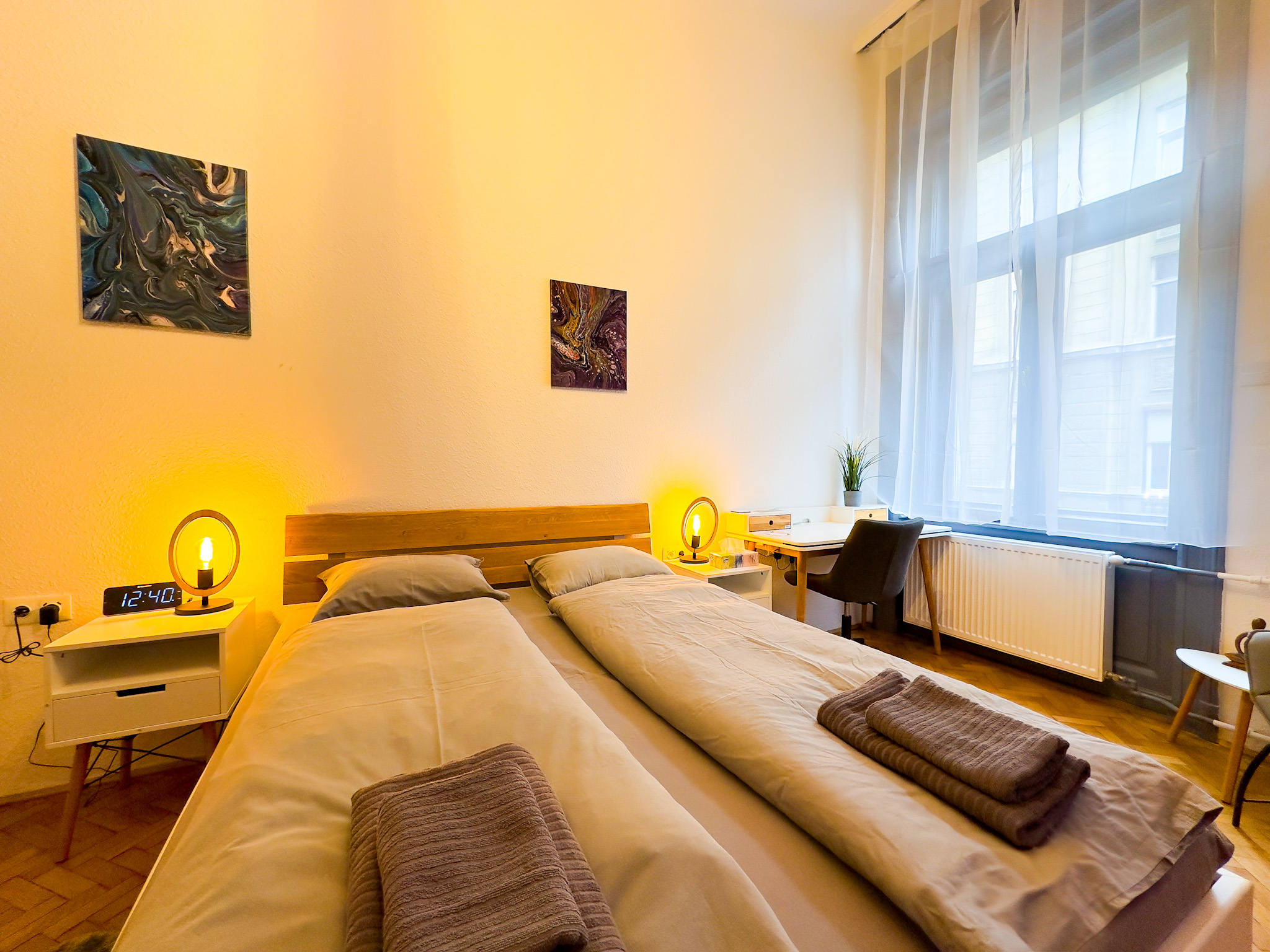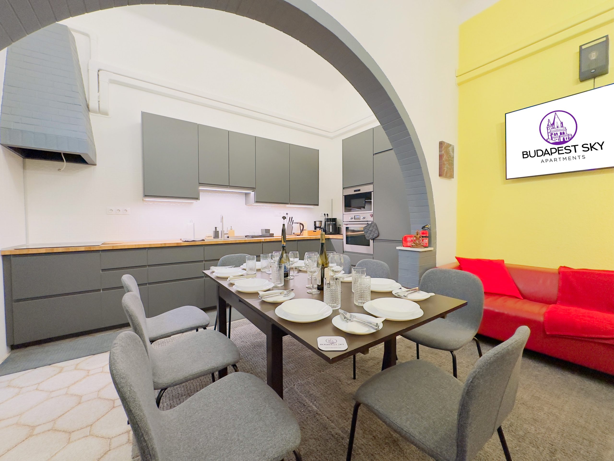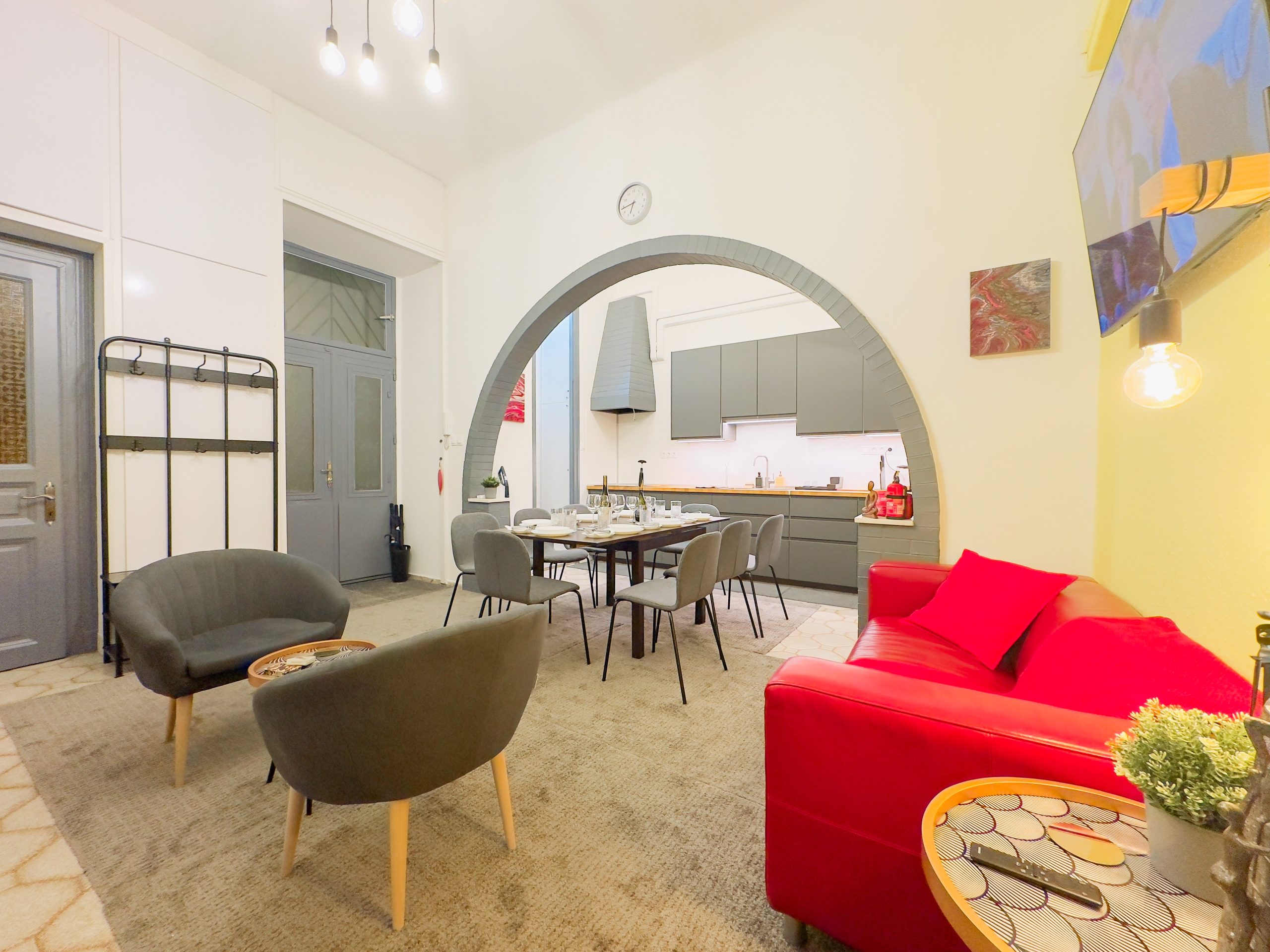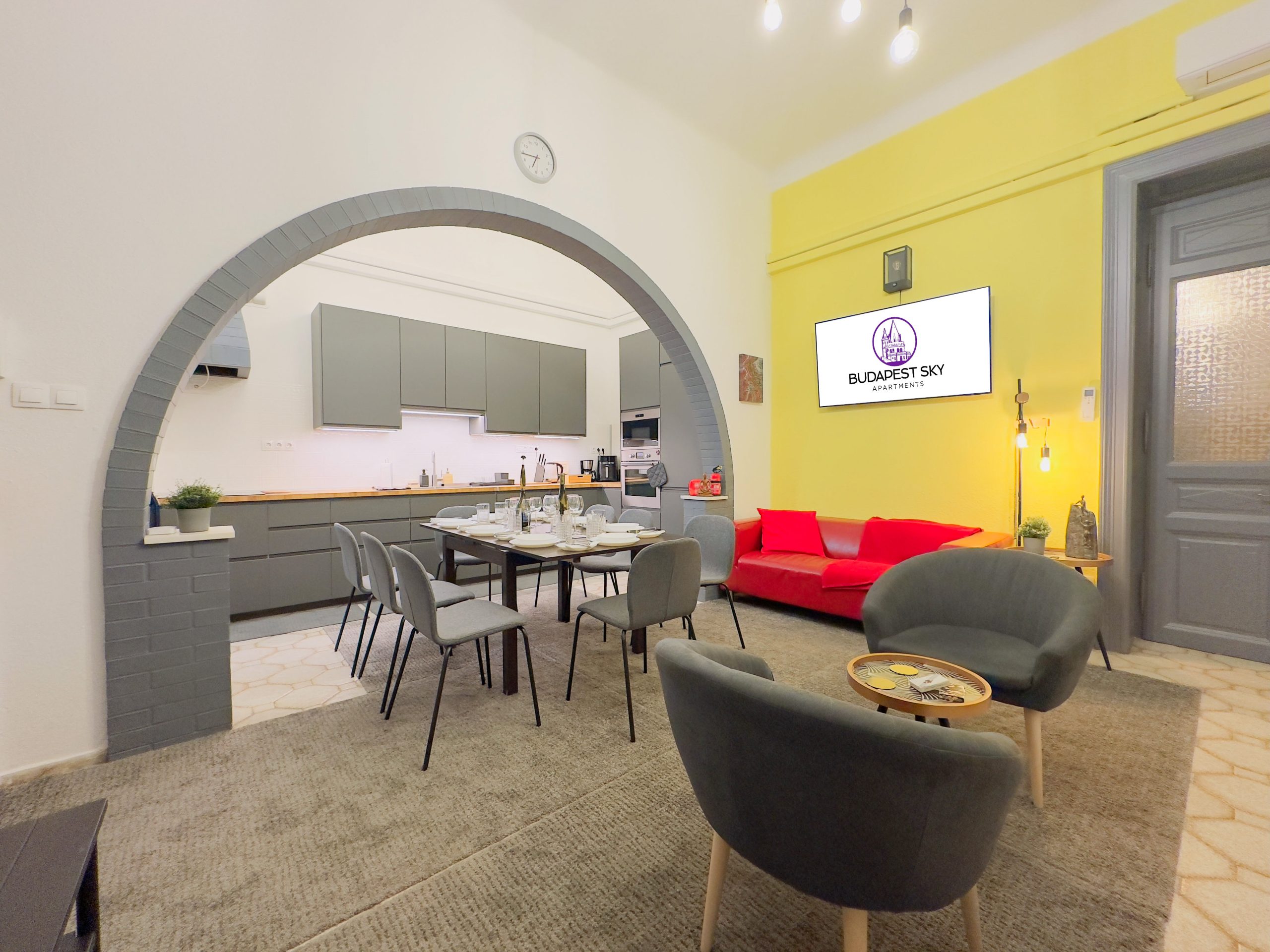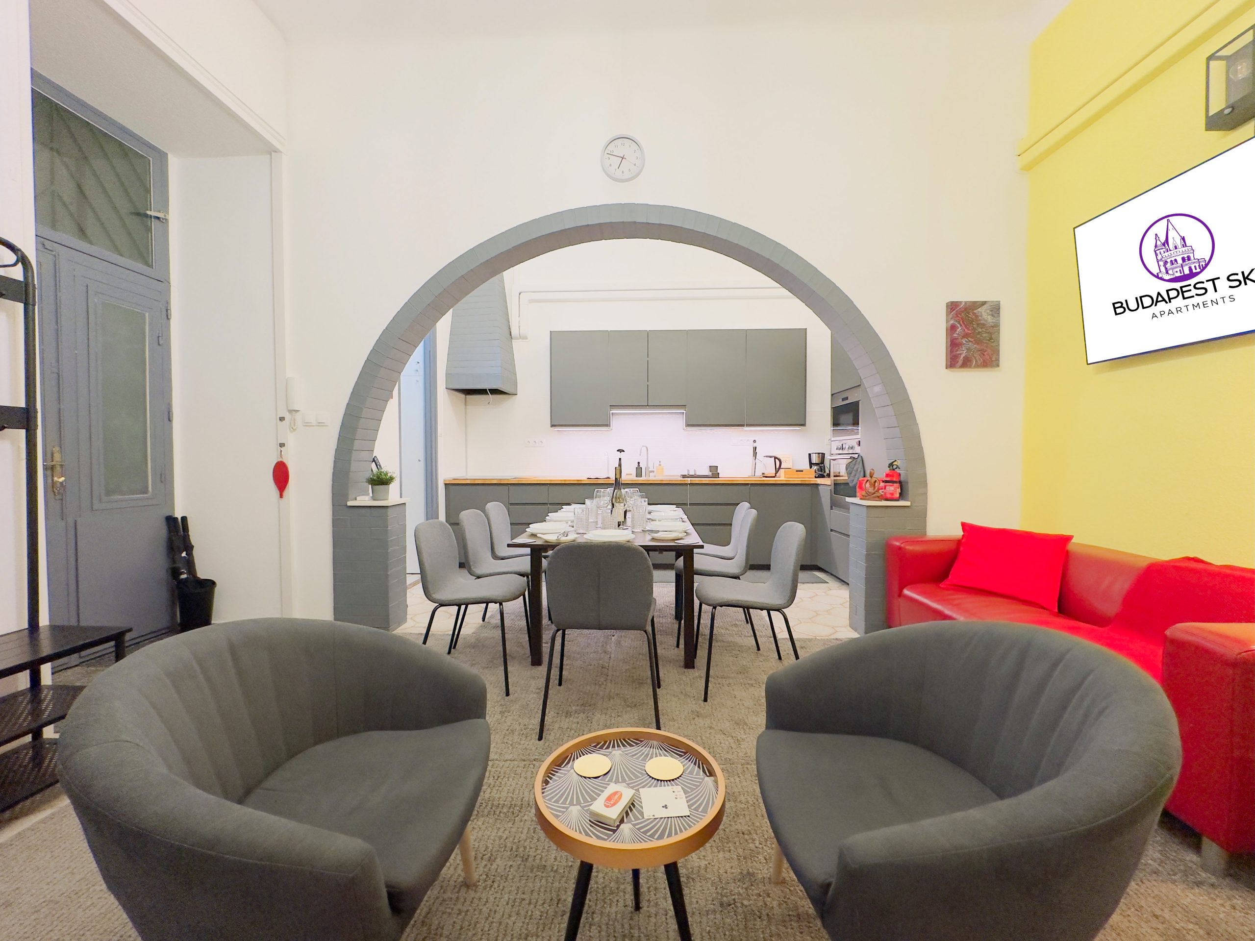 A huge, artsy, bright five-bedroom apartment right in central Budapest in a beautiful old building. It is in a quiet neighborhood, but just down the street from restaurants and nightlife and easy access to all tourist attractions. You can walk or hop on the public transportation to get to most anywhere you want to go in Budapest.