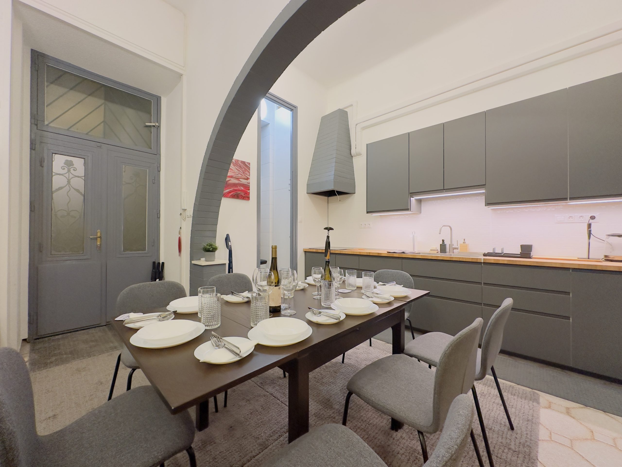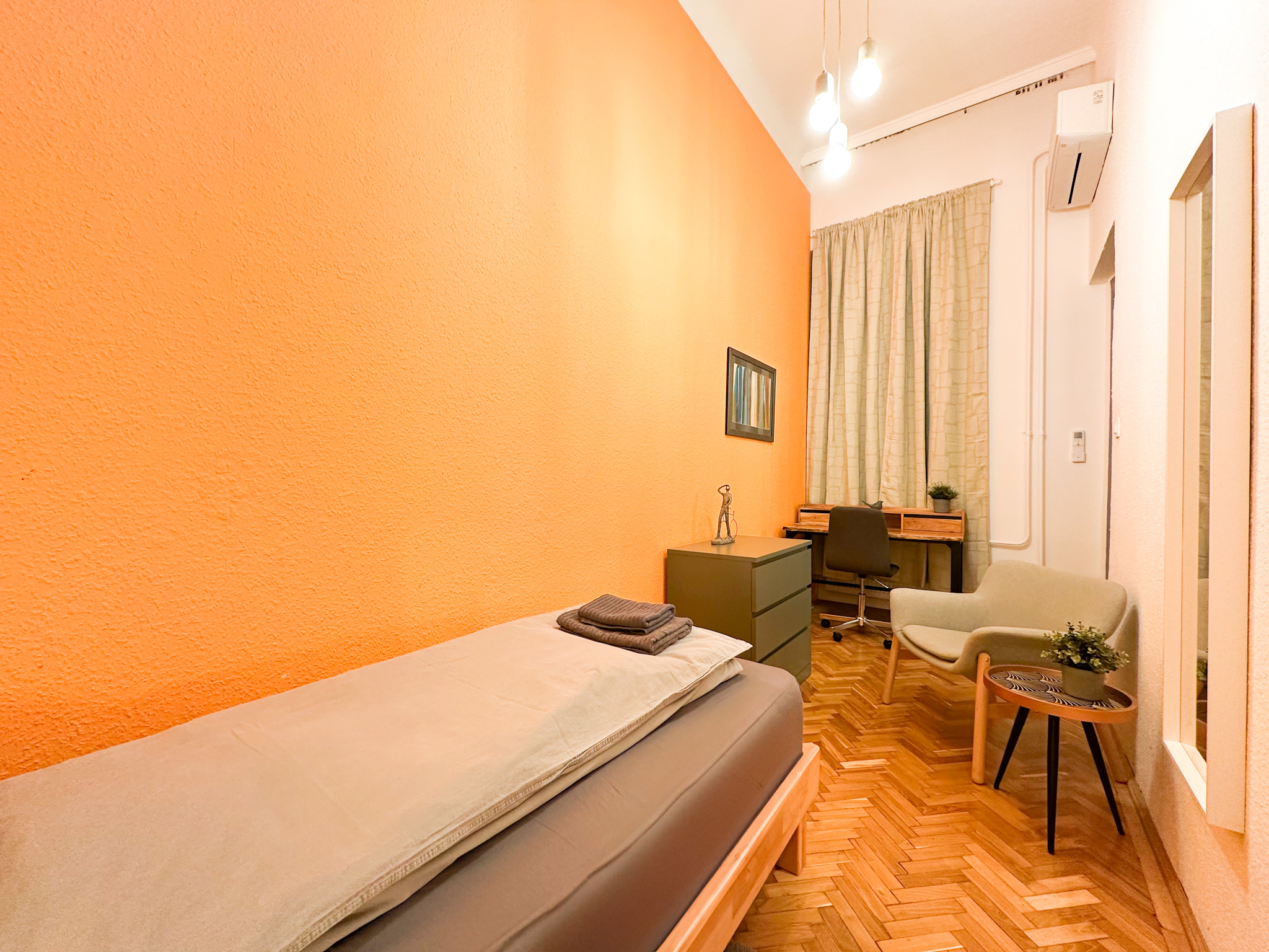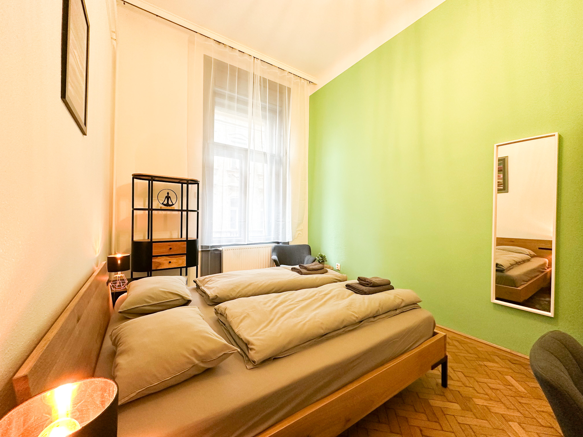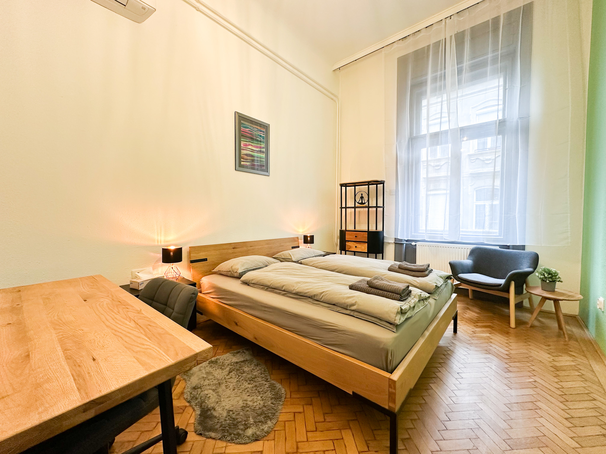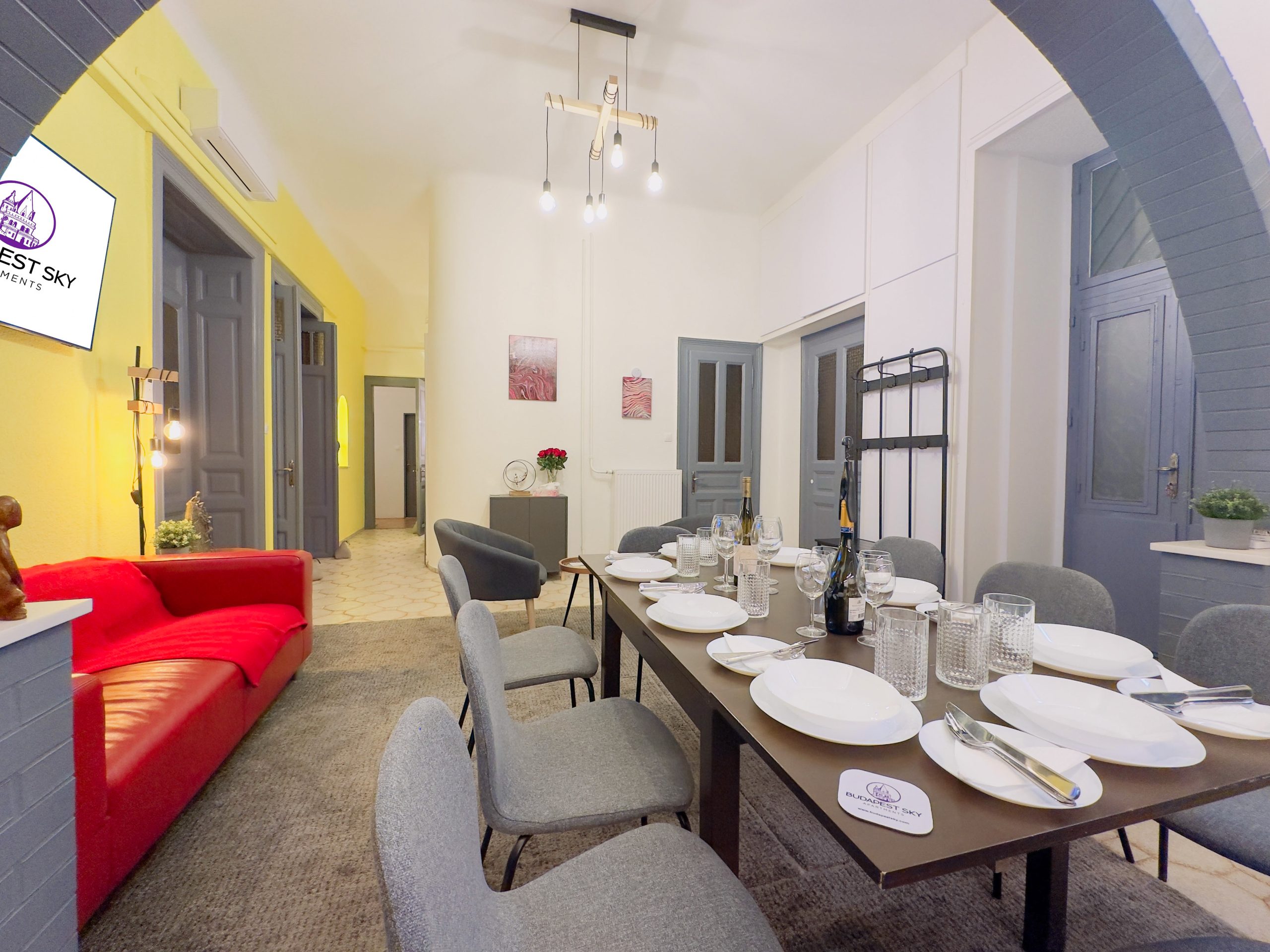 A huge, artsy, bright five-bedroom apartment right in central Budapest in a beautiful old building. It is in a quiet neighborhood, but just down the street from restaurants and nightlife and easy access to all tourist attractions. You can walk or hop on the public transportation to get to most anywhere you want to go in Budapest.